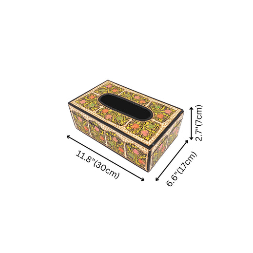 Steeped in Kashmiri tradition, this Papier-Mch tissue box features a striking black and yellow base, adorned with vibrant hand-painted chinar leaves motifs. Lightweight and elegant, it transforms an everyday necessity into an elegant decor piece that enhances any room., Material - Paper Pulp (malleable mixture of Paper and Natural Adhesive)