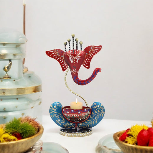 Lord Ganesha Design T-Light Holder - Red & Blue