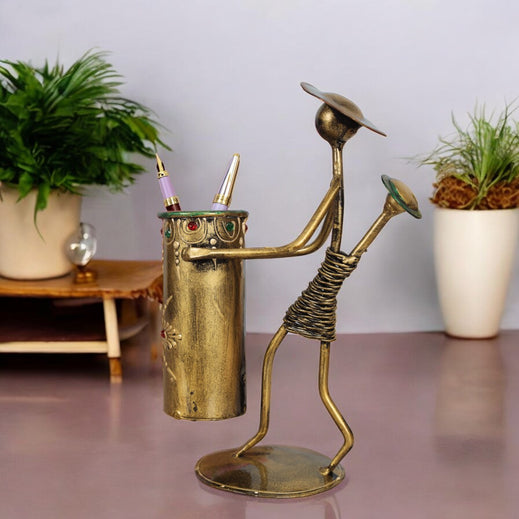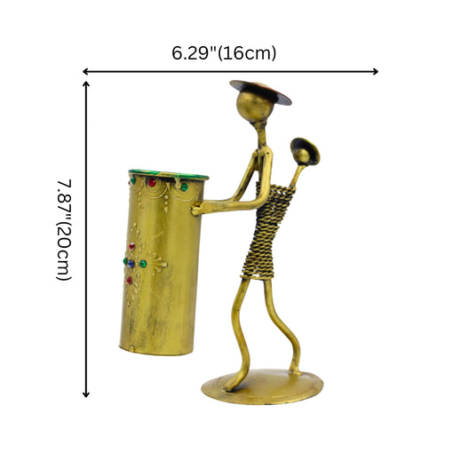 Discover the beauty of this iron pen holder, featuring a mother carrying a child and a basket, finished in vintage IRON. Its rustic elegance and abstract design highlight intricate details, including coils and a textured basket. This functional yet artistic piece adds cultural sophistication to any desk or shelf, making it an ideal gift and a standout decorative accent., Material - Iron