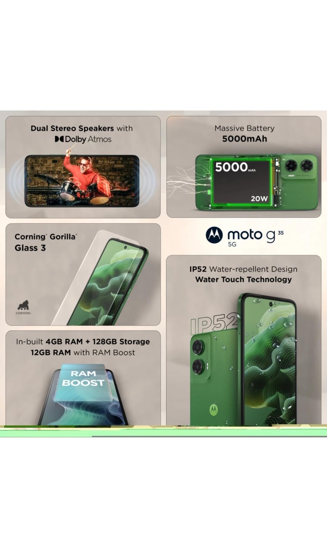 The moto g35 5G has been officially declared the fastest 5G phone under Rs. 13,000 by TechArc. Experience the fastest 5G in its segment, powered by advanced technology like 4 Carrier Aggregation (combining multiple network channels for faster speeds) and 4x4 MIMO. Enjoy lightning-fast downloads, seamless multitasking, and smooth streaming with support for all relevant 5G bands and network operators.Elevate your viewing experience with the segment's only 17.22 (6.7) cm FHD+ display. The 120 Hz refresh rate ensures smooth scrolling and gaming, while the 1000 nits peak brightness delivers vibrant visuals, even in bright sunlight. Gorilla Glass 3 protection keeps your screen safe, and the 240 Hz touch sampling rate offers lightning-fast responsiveness.