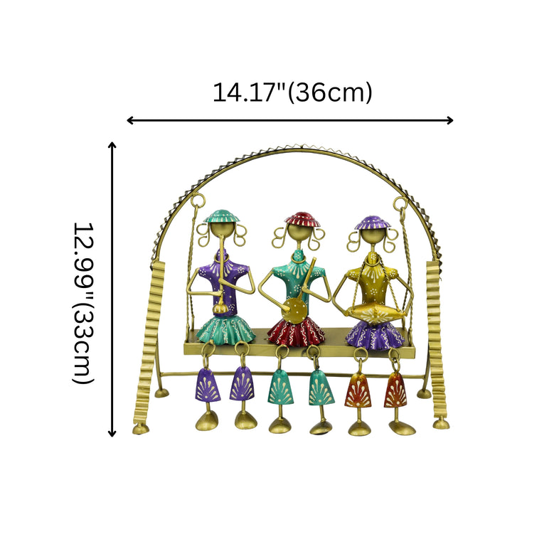 Brighten your space with this beautiful iron display of three delightful dolls, each joyfully playing a musical instrument on a whimsical swing. With vibrant colours and intricate details, it adds an artistic charm to any space.Iron