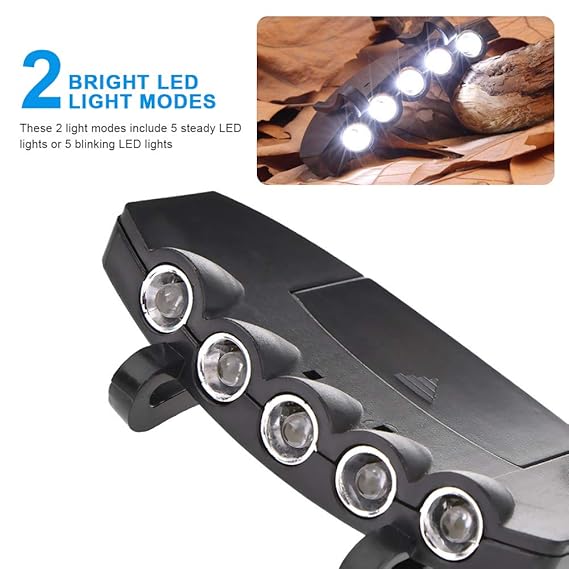 2 BRIGHT LED LIGHT MODES: This light features 2 varying LED light modes so that you are always visible during your run. These 2 light modes include 5 steady LED lights or 5 blinking LED lights, giving you multiple options for all types of running conditions.VERSATILE PLACEMENT: This LED Running Hat Light is perfect for attaching to belts, hats, backpacks, and other equipment, making it the ultimate safety accessory for running, biking, and any other activities at night.HIGH QUALITY: Lightweight and made to take plenty of rugged treatment.This high quality Cap Light will bring you power-saving and pragmatic illumination.LONG LASTING: Bulbs last up to 100,000 hours; lithium cell batteries last up to 96 hours.GREAT GIFT FOR: Gadget lovers, campers, men, women, hikers, runners, mechanics, handymen.