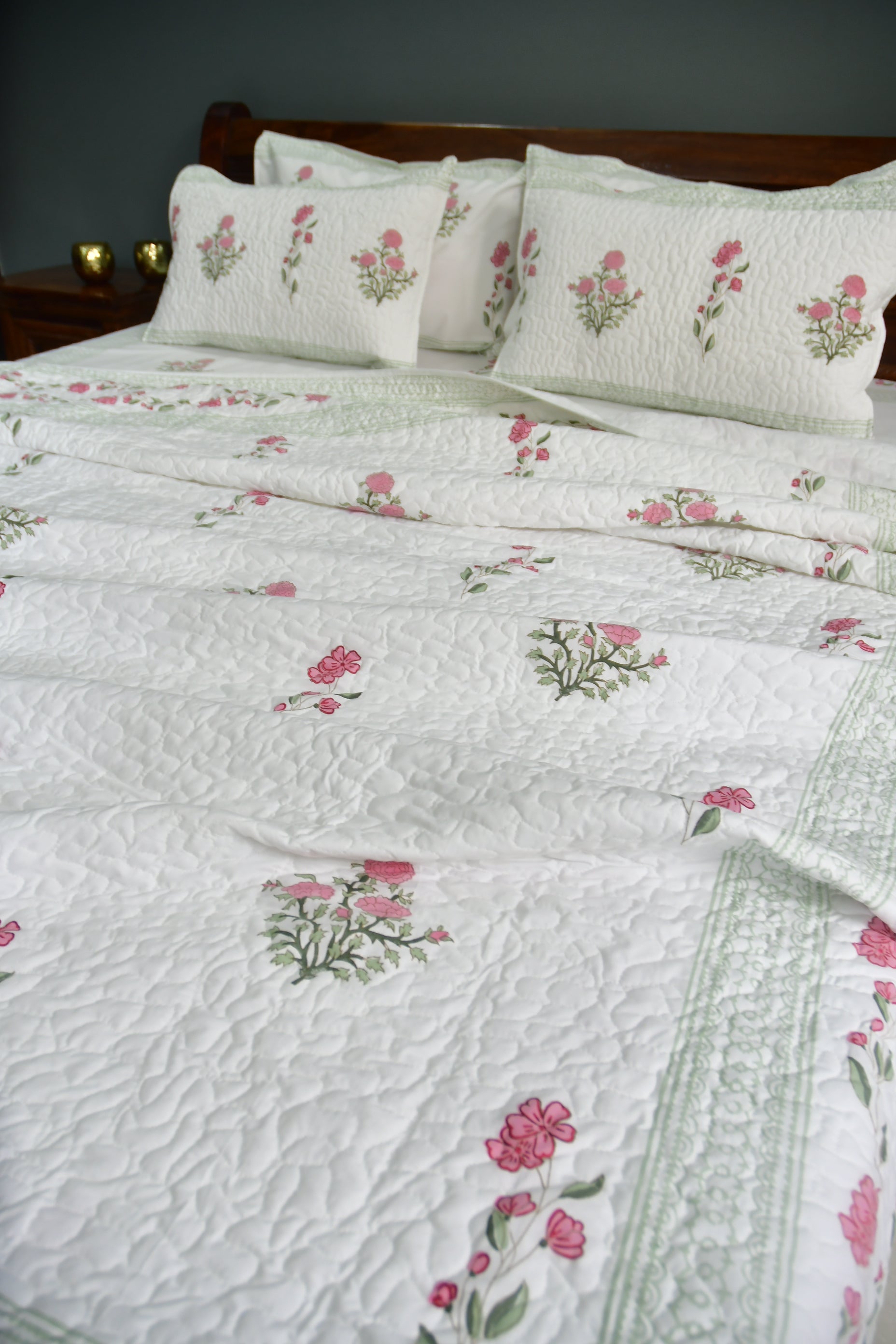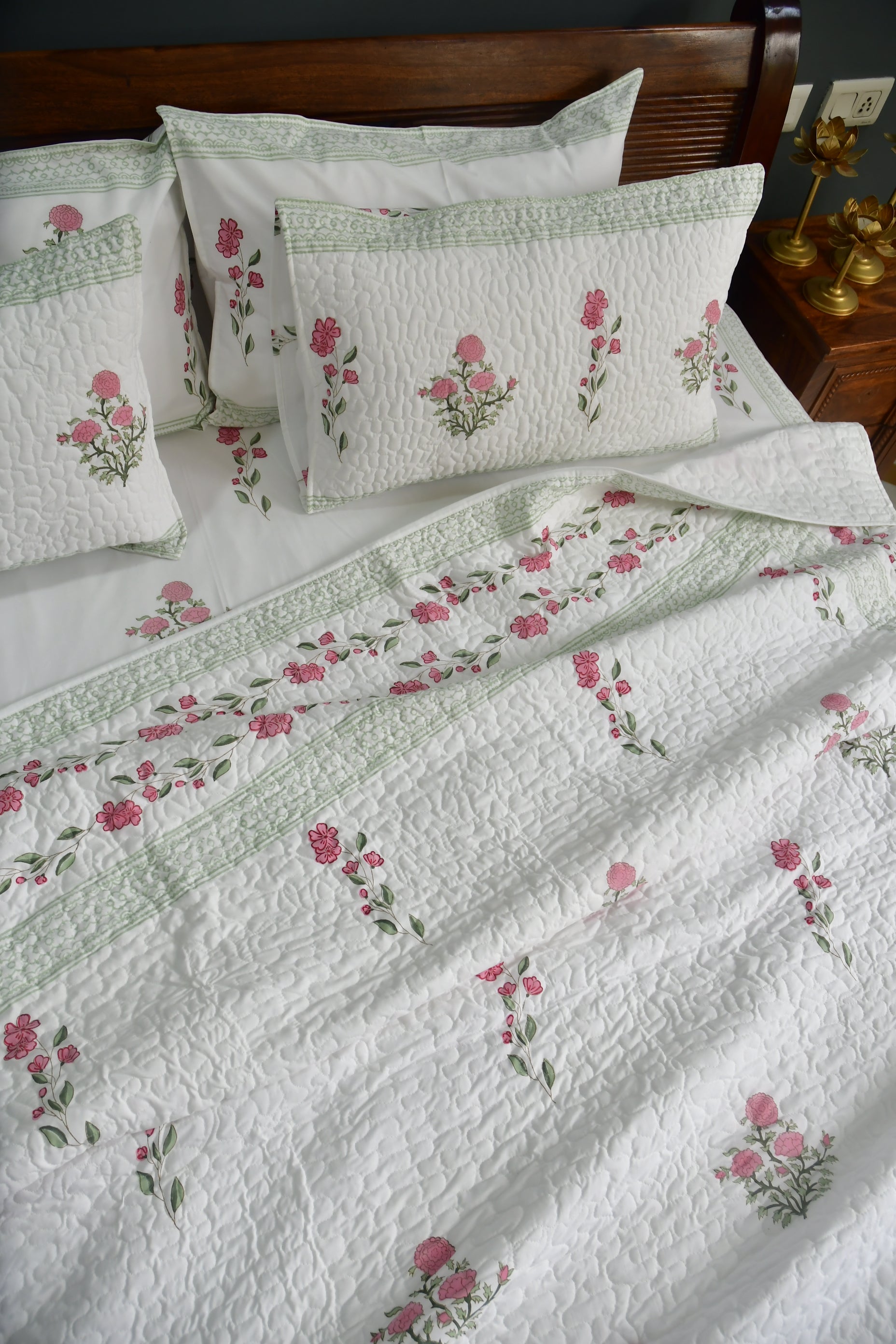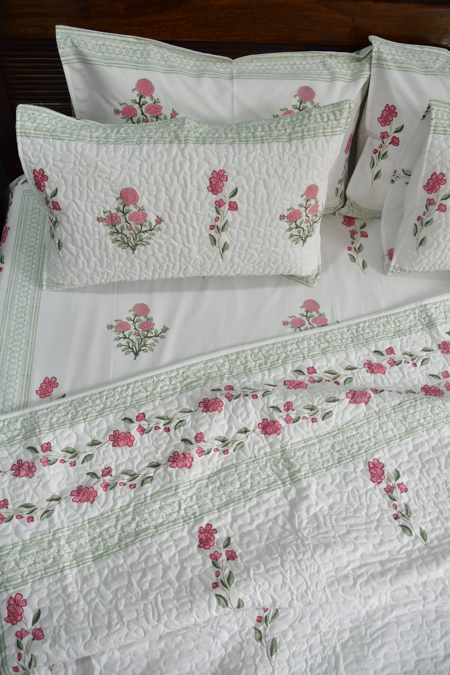 Pink Gulshan Handblock Cotton Bedding set (Super King (108*108 inches) bedsheet + King (90x108 inches) quilted bedcover)