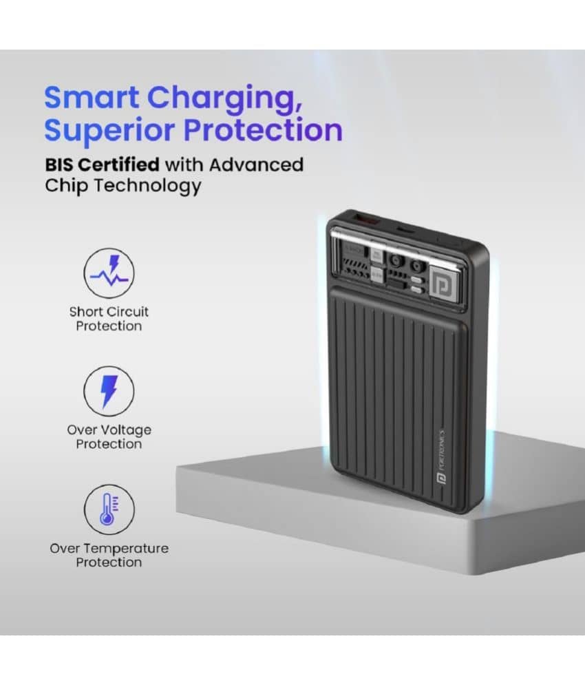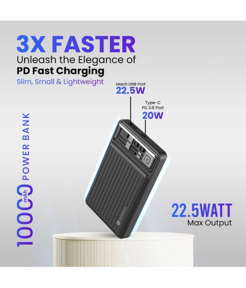 Portronics Power Shutter Pro 10000mAh Powerbank, In Built Type C PD Cable, Bidirectional Type C Port, Super-Fast Charging