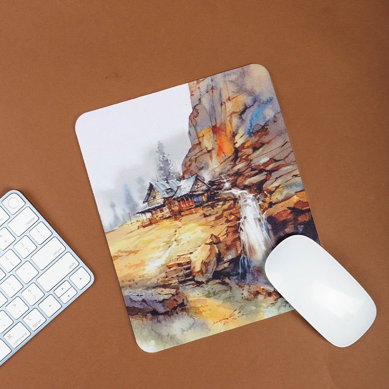 Material RubberDimension 9 inches by 7.5 inchesSmooth surface for optimal mouse movement.Transform your workspace with our serene mouse pad design, featuring a mesmerizing waterfall beside a cozy mountain home. This durable, high-quality print brings a touch of tranquility to your desk.