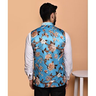 PrintCulture Men Printed Blue Cotton Blend Nehru Jacket