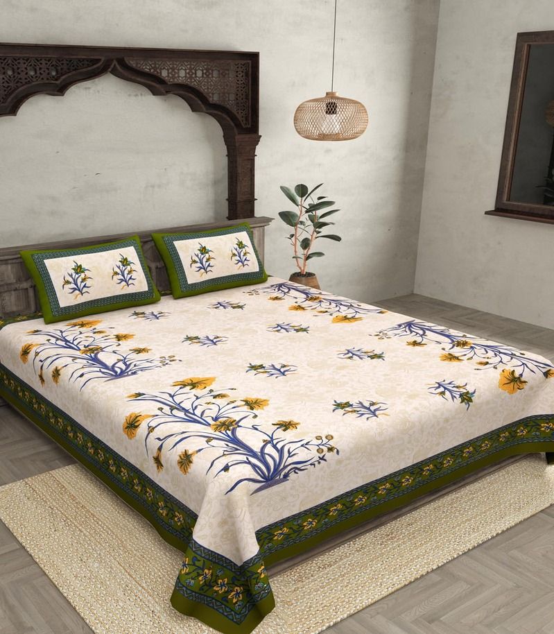 MVB 100% Cotton 180 TC Floral Double Bedsheet Set Transform your bedroom into a serene and stylish retreat with the MVB 100% Cotton 180 TC Floral Bedsheet Set.Designed for both comfort and elegance, this bedsheet is made from premium-quality cotton, offering a soft, breathable, and skin-friendly feel.With a 180 thread count, it strikes the perfect balance between durability and cozy comfort, ensuring a restful nights sleep.The refreshing green floral print adds a natural and soothing vibe to your space, making it a perfect choice for those who love a touch of nature-inspired beauty in their home.This set includes a generously sized double bedsheet (90" X 108"), along with two matching pillow covers, bringing a cohesive and elegant look to your bedding.Why Youll Love It: 100% Pure Cotton Soft, breathable, and gentle on the skin 180 Thread Count A perfect blend of comfort and durability Elegant Green Floral Design Adds freshness and style to your bedroom Perfect Fit (90" X 108") Ideal for double beds with full coverage Includes 2 Matching Pillow Covers A complete and coordinated look Easy Care & Long-Lasting Machine washable, fade-resistant, and quick to dry Upgrade your bedding with MVBs Soft & Stylish Floral Bedsheet Set, designed to make your sleep space as comfortable as it is beautiful!