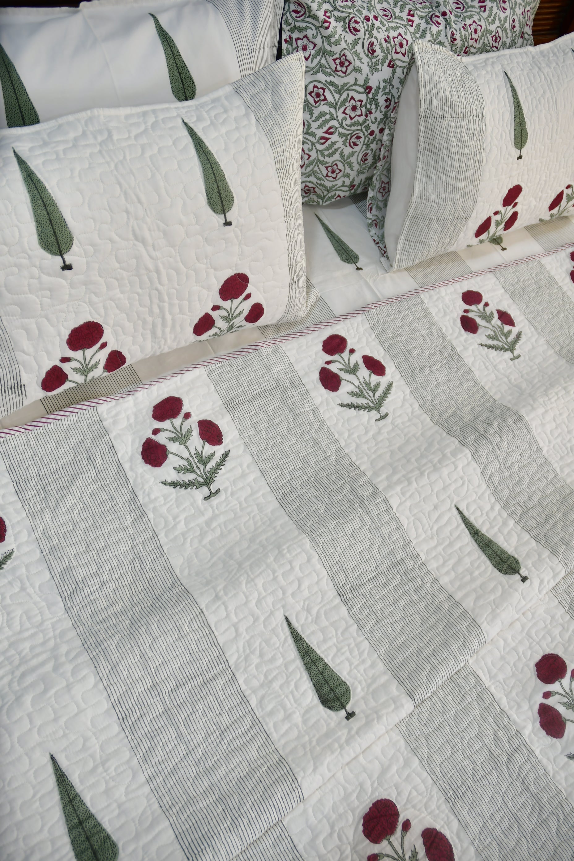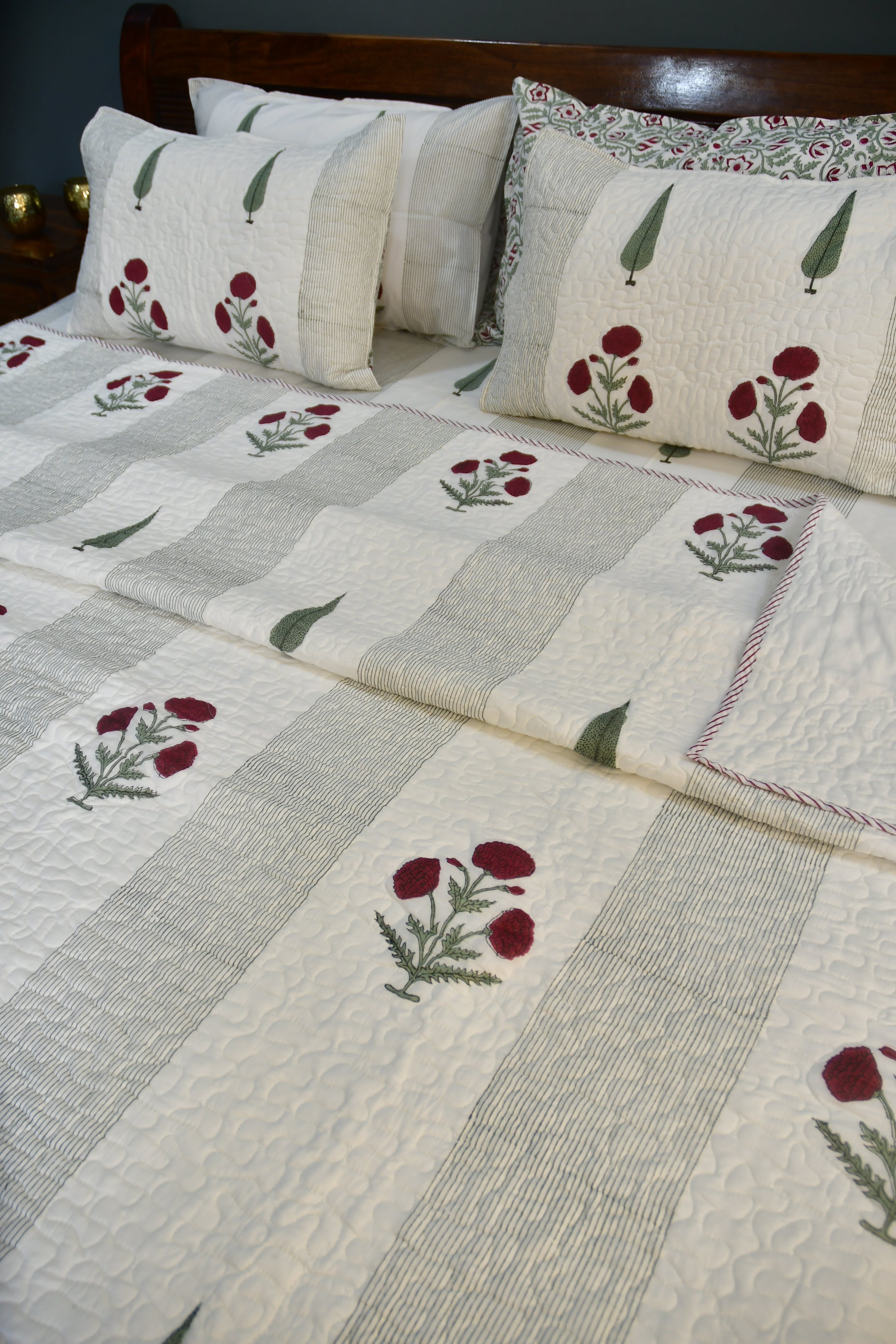 Red Poppy Bedding set : Premium Hand Block Cotton Super King (108*108 inches) bedsheet + King (90x108 inches) quilt