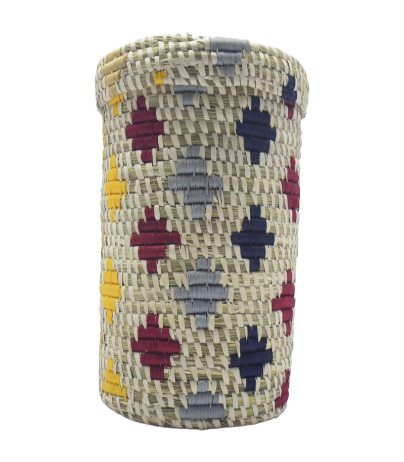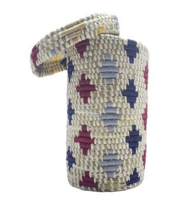 MVB Sabai Grass Basket with Lid Artisanal Sophistication and Functionality*Handwoven | Eco-Friendly | Secure Storage | Versatile & Stylish Infuse your home or workplace with a sense of traditional artisanal skill mixed with contemporary practicality through the MVB Sabai Grass Basket with Lid. Exquisitely hand-crafted from renewable Sabai grass, this practical yet sophisticated basket boasts an attractive pattern of purple and blue diamond shapes against the natural beige color of the grass. Made for safe storage, the snug lid keeps your items organized and neatly stored, making this basket perfect for storing household items, office materials, or personal accessories.