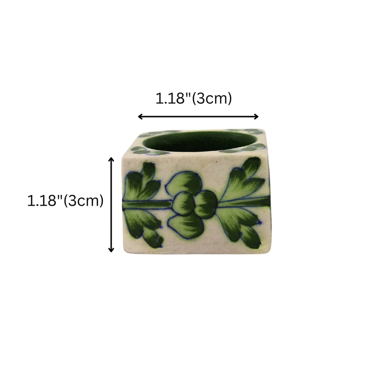 This stunning Blue Pottery T-Light Candle Holder adds elegance and warmth to any room with its vivid white and green floral patterns. When lit, it creates a lovely ambiance, making it a perfect standalone piece or a striking complement to other blue pottery items.Blue Pottery - A blend of quartz powder, ground glass, saji, katira gond, and multani mitti.