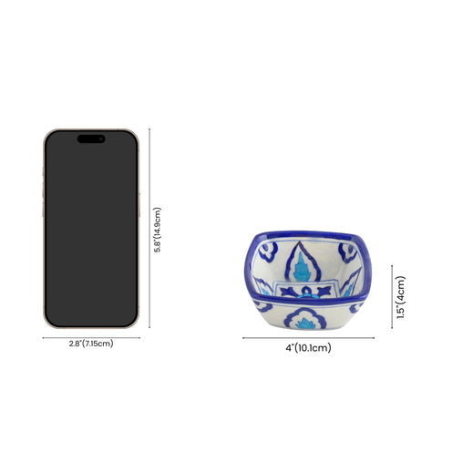 An artistic treasure from Jaipurs Blue Pottery tradition. The hand-painted floral design reflects a time-honoured craft, blending heritage with elegance. Ideal for serving dry snacks or displayed as wall decor, these bowls bring an artistic charm that never fades.Material - Blue Pottery - A blend of quartz powder, ground glass, saji, katira gond, and multani mitti.