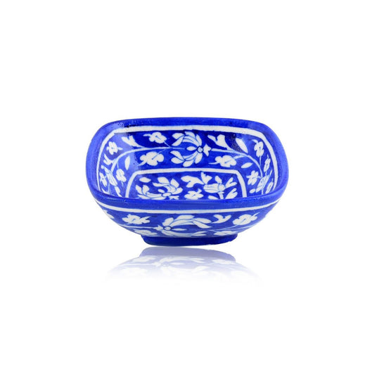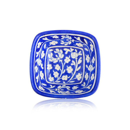 An embodiment of beauty and tradition, these cobalt blue bowls are carefully handcrafted and hand painted with delicate floral designs. Its GI-tagged and made using centuries-old techniques, they seamlessly blend function and art. Elevate your dining experience or decorate your space with this eternal masterpiece.Material - Blue Pottery - A blend of quartz powder, ground glass, saji, katira gond, and multani mitti.