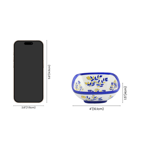 Brighten up your table with this pair of charming Blue Pottery bowls. Decorated with cheerful yellow flowers and vibrant blue leaves, these bowls are perfect for serving or adding a pop of colour to your decor. Made in Jaipur, they carry the proud legacy of GI-tagged craftsmanship.Material - Blue Pottery - A blend of quartz powder, ground glass, saji, katira gond, and multani mitti.