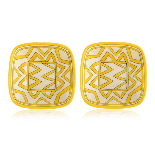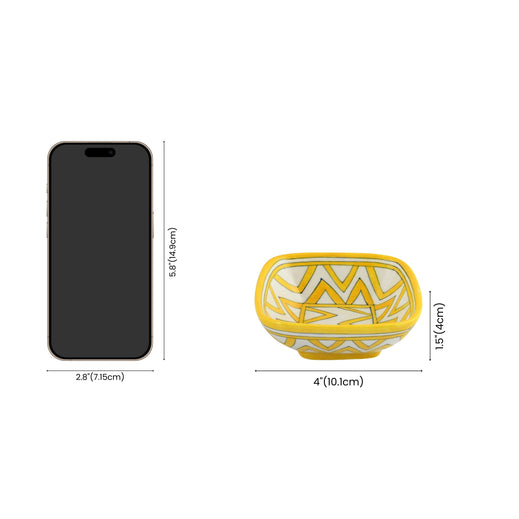 A celebration of colour and craftsmanship, these stunning yellow bowls feature a striking geometric pattern. This handmade Blue Pottery piece from Jaipur is designed to captivate and impress. Whether placed on a table or shelf, they bring vibrancy, and artistic excellence to any setting.Material - Blue Pottery - A blend of quartz powder, ground glass, saji, katira gond, and multani mitti.