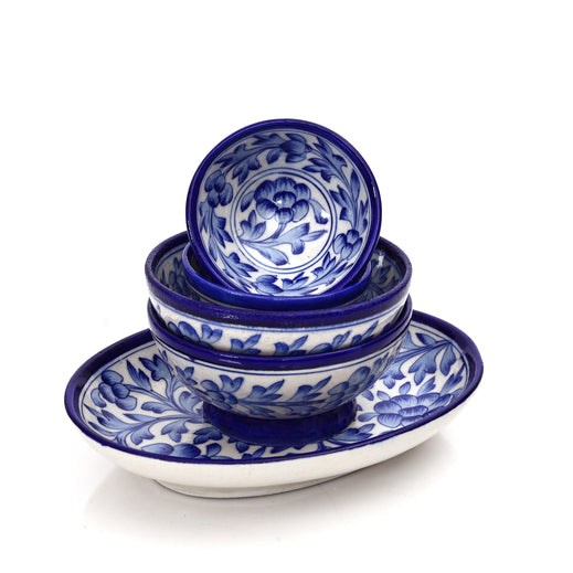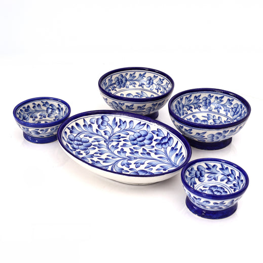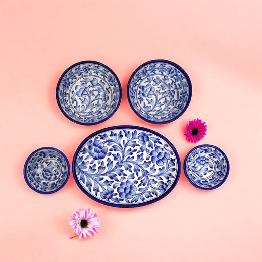 Set of 5 Jaipur Blue Pottery  Floral Oval Platter & Matching Bowls | Handcrafted Tableware for Home Dcor & Serving