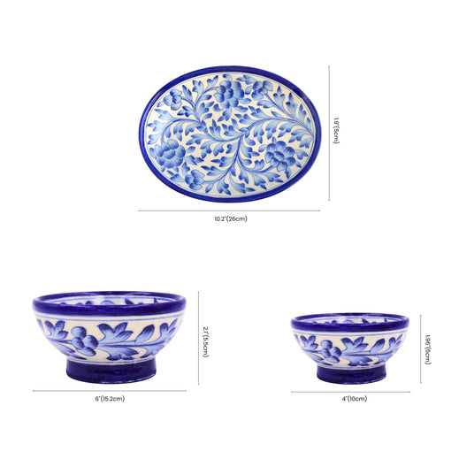 Elevate your dining and dcor collection with this Set of 5 Jaipur Blue Pottery masterpieces, showcasing intricate hand-painted floral motifs in classic indigo blue. The set includes one oval platter (10.2 x 6), one medium bowl (6 diameter, 2.7 height), and one small bowl (4 diameter, 1.9 height)each individually handcrafted using the iconic clay-free Blue Pottery technique of Jaipur. Made from eco-conscious materials like quartz, and natural gum, this set is perfect for serving snacks, desserts, or simply adding a touch of timeless elegance to your space. A fusion of utility and tradition, these pieces make thoughtful gifts or collectible art for your home.Material - Blue Pottery - A blend of quartz powder, ground, saji, katira gond, and multani mitti.