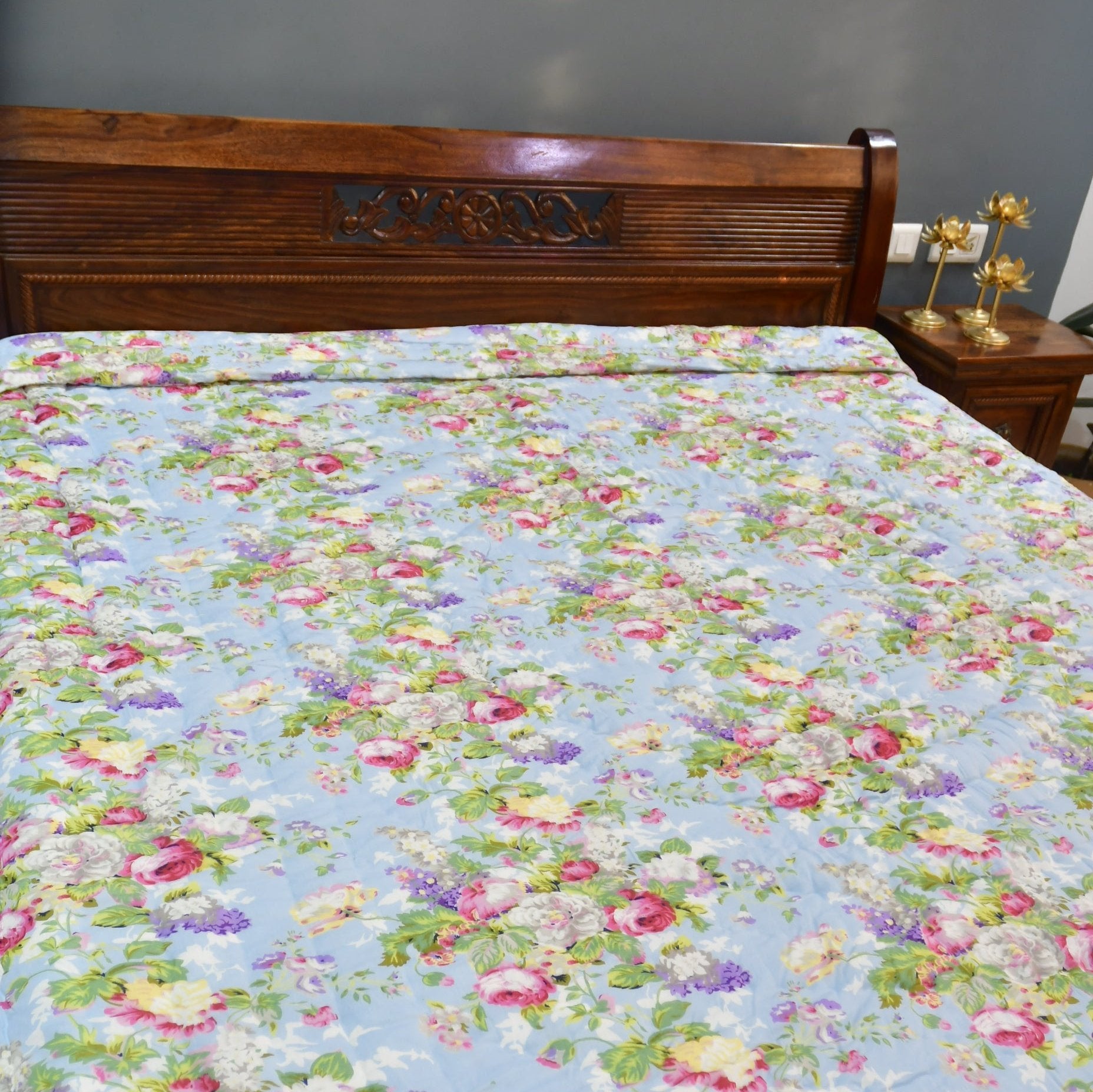 Snuggle in our cozy n soft cotton quilts. Just made for that perfect comfort ,everyone seeks in a quilt .Bright blue colour n attractive floral design makes it perfect for any colour theme n decor.A Breath of Fresh Air: The calming sky blue color evokes feelings of peace and tranquility, creating a perfect environment for restful sleep.Blooming Beauty: The intricate floral pattern adds a touch of elegance and visual interest to your sleep space, while maintaining a sense of calm.Year-Round Comfort: Crafted from premium, breathable materials, this lightweight quilt ensures comfortable sleep throughout the year.Exceptional Quality: Experience the difference of meticulous craftsmanship and premium materials. The Sky Blue Floral Quilt is an investment in lasting quality.Beautiful floral design adds to the beauty of the Craftsmanship.Reversible designsize 90x108 inches100% cotton100% natural cotton filled