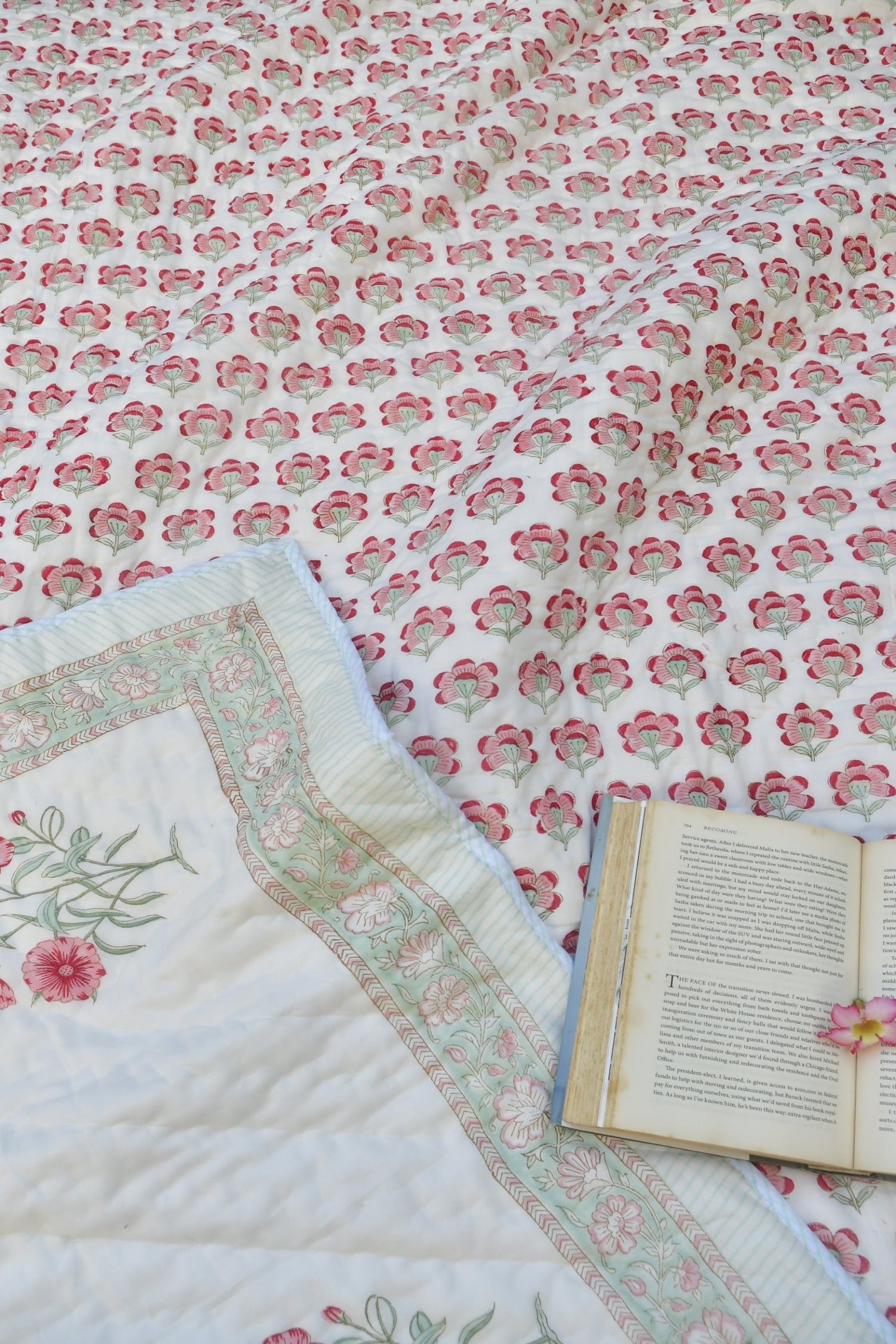Experience ultimate comfort with our cozy and soft Mul Mul quilts, crafted for the perfect warmth and relaxation you crave. The vibrant colors and elegant design make it a perfect match for any home decor. Featuring a stunning floral pattern, this quilt reflects the fine craftsmanship of traditional hand block printing. With a reversible design, it offers versatility and style.Made from 100% Mul Mul fabric and filled with 100% natural cotton, this quilt promises a cozy, breathable sleep.Size: 90x108 inches.