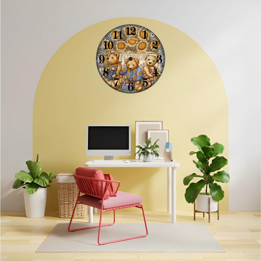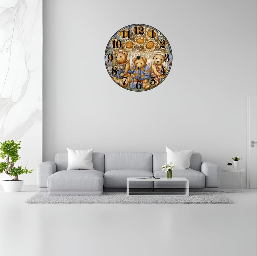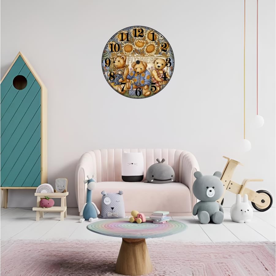 DESIGN THEME: Charming teddy bear wall clock featuring three adorable bears surrounded by sunflowers, perfect for creating a warm and inviting atmosphereVERSATILE DECOR: Ideal decorative timepiece for children's rooms, nurseries, playrooms or any space needing a touch of whimsy and functionalityDISPLAY FEATURES: Large, clear numbers arranged in a classic circular format with detailed artistic illustrations make time-telling easy and enjoyableGIFT POTENTIAL: Makes an excellent return gift or birthday present, suitable for children and teddy bear enthusiasts of all agesROOM COMPATIBILITY: Harmoniously complements various interior styles, from modern nurseries to traditional children's bedrooms with its classic round shape