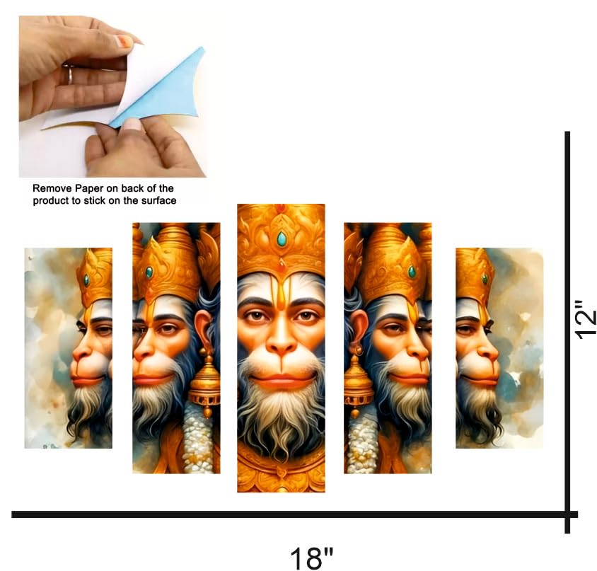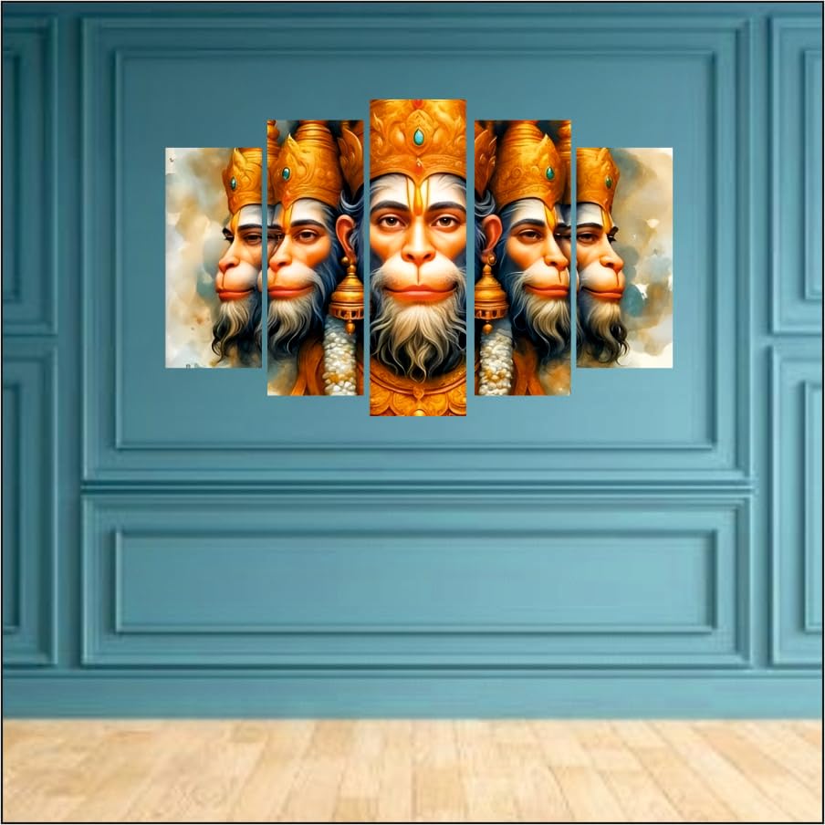 Spiritual Wall Art: Stunning 5-panel canvas of Lord Hanuman for home or temple decor.Symbol of Devotion: Represents strength faith courage and divine protection.Premium Print Quality: High-definition colors on durable canvas for lasting vibrance.Sacred Decor Accent: Elevates the spiritual energy of your living space or prayer area.Multi-Panel Layout: Modern five-piece design creates a bold visual presence.Perfect Gift Choice: Ideal for religious occasions festivals or housewarmings.Easy to Hang: Lightweight frames with mounting hooks included for convenience.Cultural Elegance: Reflects Indian heritage and artistic devotion to Hanuman Ji.