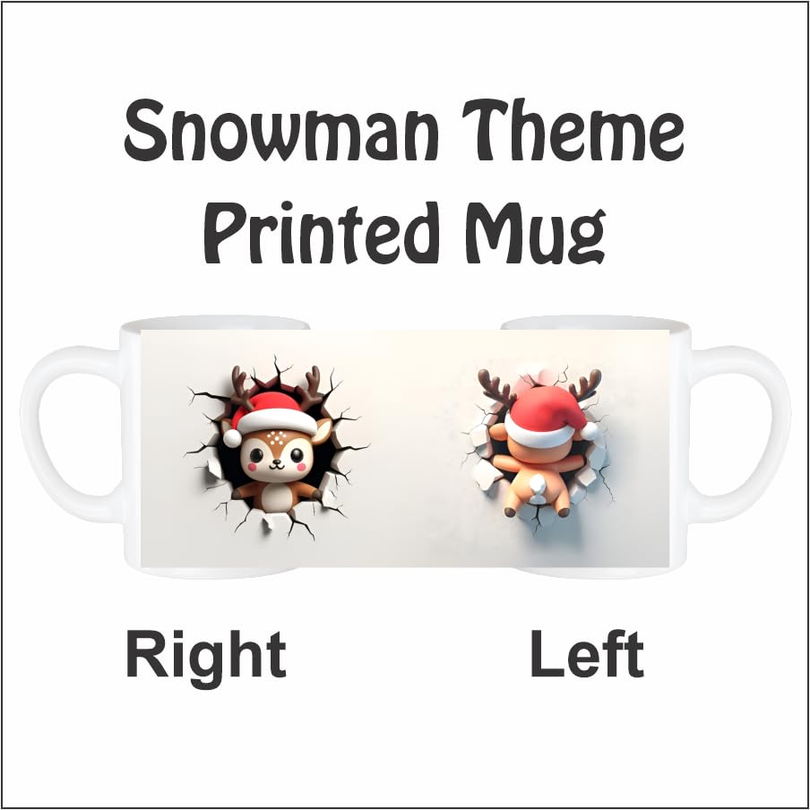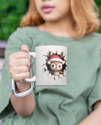 Festive Reindeer Design: Features a reindeer wearing a Santa hat in a fun wall-break 3D-style graphic that captures the holiday spirit.Perfect Christmas Gift Idea: An excellent choice for gifting during Christmas parties family gatherings Secret Santa or stocking stuffers.High-Quality Ceramic: Made from durable ceramic material for long-lasting use and a premium drinking experience.Microwave and Dishwasher Friendly: Safe to heat and clean without affecting the print quality or mug structure.Holiday Vibes All Around: Adds a cheerful and whimsical touch to your kitchen table desk or coffee station.Comfortable Grip: Ergonomic handle provides a secure and comfortable hold for both kids and adults.Bright and Fade-Resistant Print: Vivid high-resolution artwork that maintains its color and fun look after every wash.Multi-Purpose Use: Suitable for coffee tea hot chocolate milk or even as a festive pen holder or decoration piece.