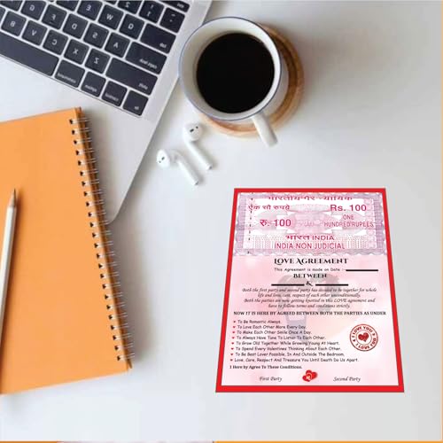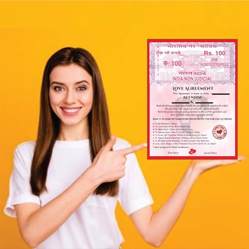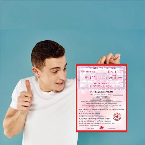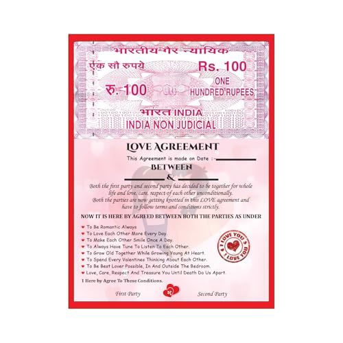 Unique Love Contract Design: Mimics an Indian stamp paper with romantic terms for couplesPerfect Gift for Couples: Ideal for boyfriend girlfriend husband wife fianc or partnerCustomizable: Write names and date for a personalized and meaningful keepsakeFun & Lighthearted: Adds humor to your relationship with sweet romantic commitmentsGreat for Gifting: Surprise your partner on Valentine's Day anniversary or birthdayDecorative Keepsake: Can be framed and displayed in your room or memory wallRelationship Booster: Encourages bonding laughter and love through daily vowsQuality Print: Durable high-quality print with heart-themed design and vibrant red tones
