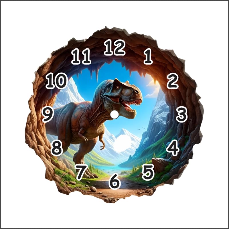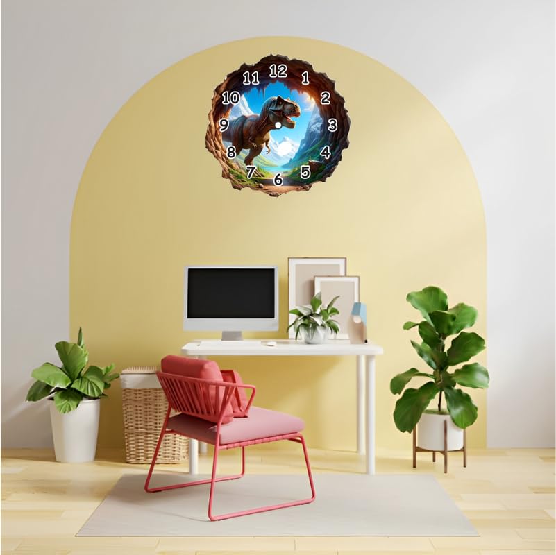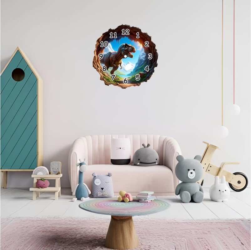 3D T-Rex Design: Stunning visual of a dinosaur stepping out of a rocky cave?eye-catching and funPerfect for Kids: Ideal wall clock for boys? bedrooms nurseries or dino-themed playrooms.Durable & Lightweight: Made from high-quality MDF with a smooth laminated finish.Easy Time Reading: Bold white numbers and analog display perfect for learning time.Unique Gift Idea: Great birthday or holiday gift for dino enthusiasts and young explorers.
