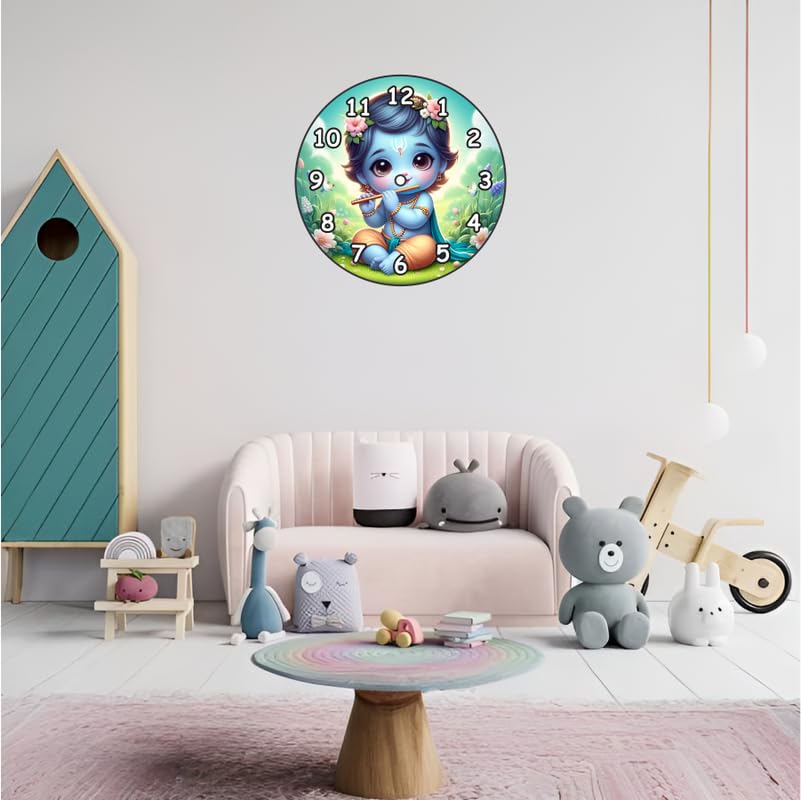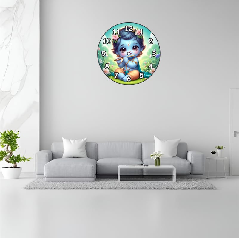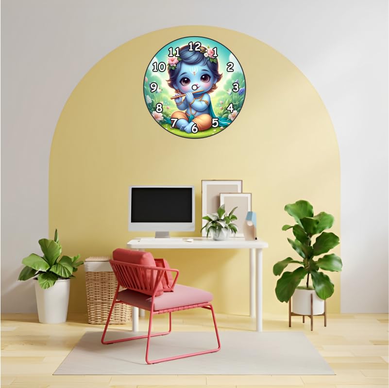 Exquisite Design ? Beautifully crafted wall clock featuring a divine figure playing the flute enhancing your home?s aesthetic appeal.Premium Quality ? Made from durable materials for long-lasting performance and reliability.Vibrant Colors ? Rich hues and intricate detailing make this timepiece a standout addition to any home decor.Versatile Placement ? Ideal for living rooms bedrooms kitchens offices and other spaces.Thoughtful Gift Choice ? A perfect gift for spiritual art lovers blending culture and functionality in one elegant piece.