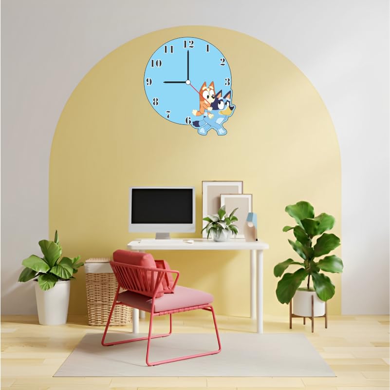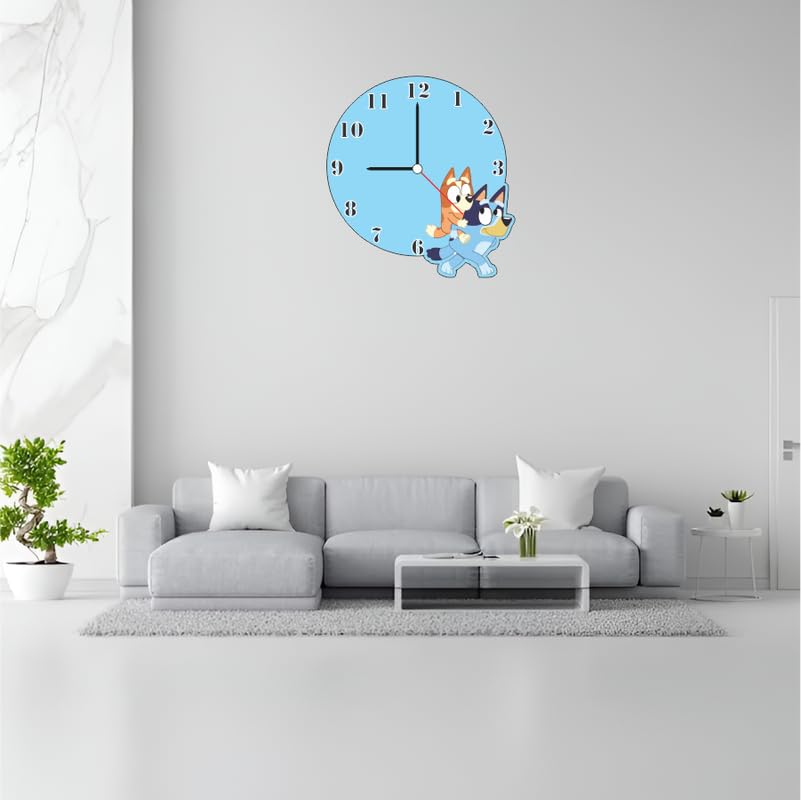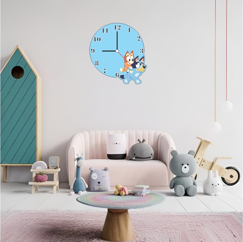 Features beloved Bluey cartoon characters for kid appealIdeal for bedrooms playrooms nurseries or classroomsBright sky-blue design enhances any child-friendly spaceNon-silent quartz movement delivers nostalgic ticking soundEasy to hang lightweight design powered by one AA battery
