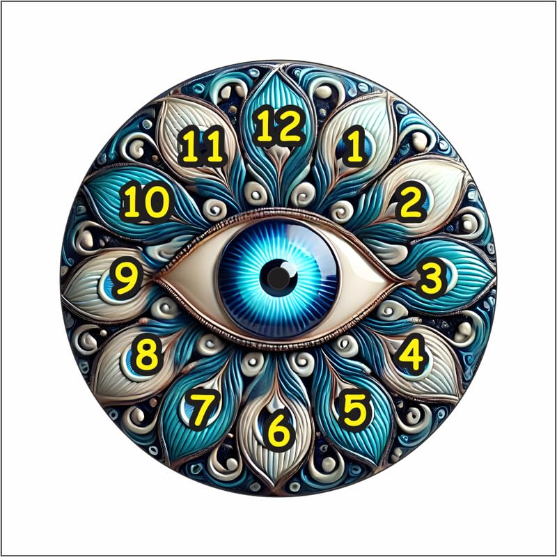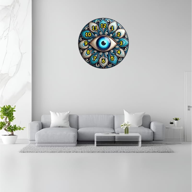 Striking Evil Eye design with intricate patterns.Believed to offer protection and good fortune.Clear numbers for easy time-telling.Perfect for unique home or office decor.Meaningful gift for spiritual enthusiasts.