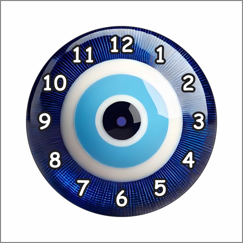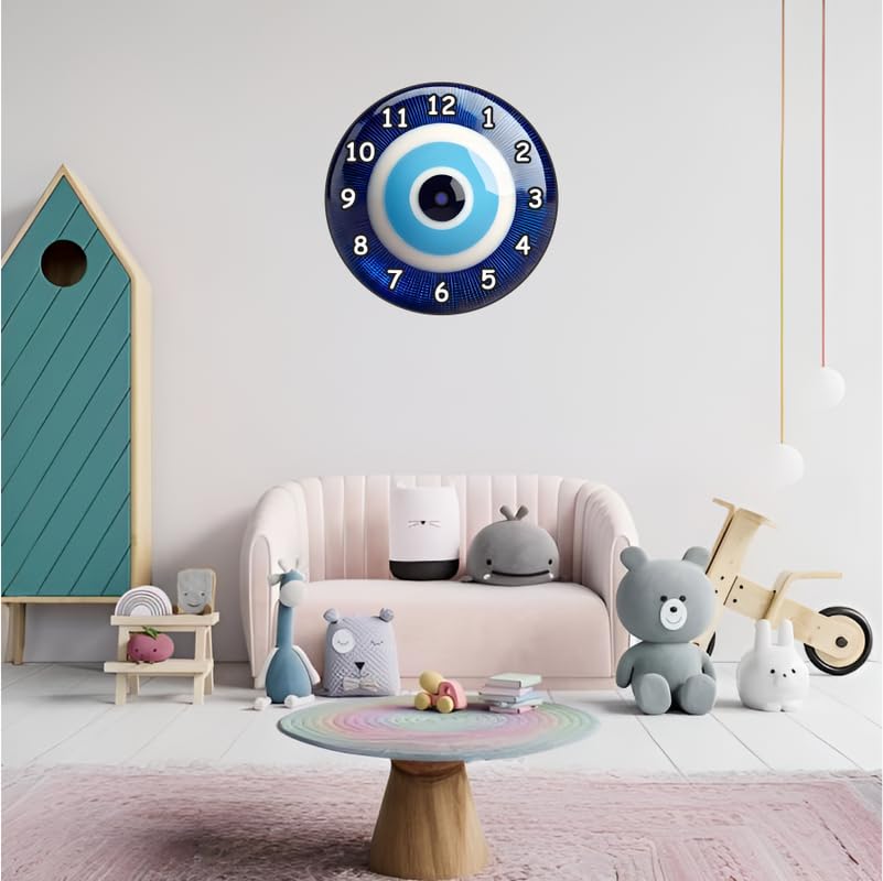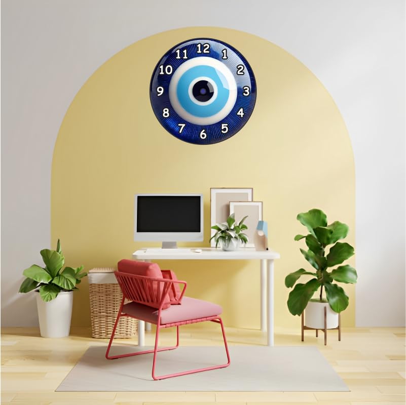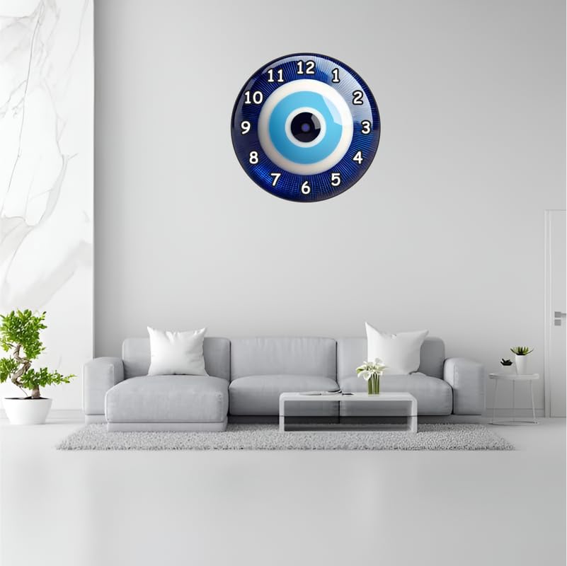 Unique evil eye design symbolizing protection and good luckNon-silent quartz movement with ticking sound for traditional charmVibrant colors with high-contrast numbers for easy time readingMade of durable MDF material with smooth edges and glossy finishIdeal for gifting during housewarmings festivals birthdays or spiritual occasions