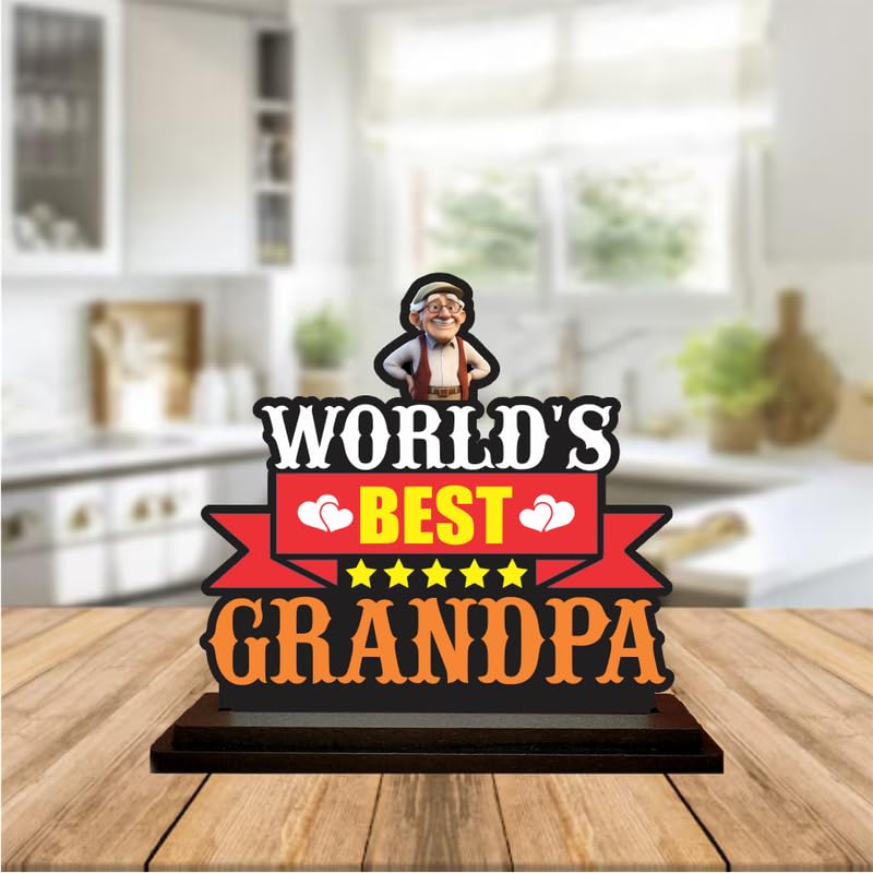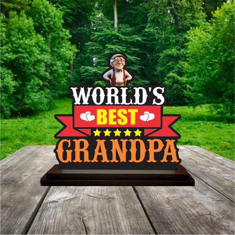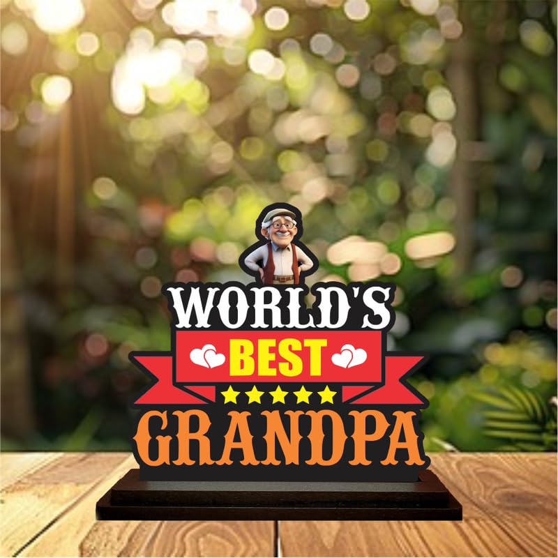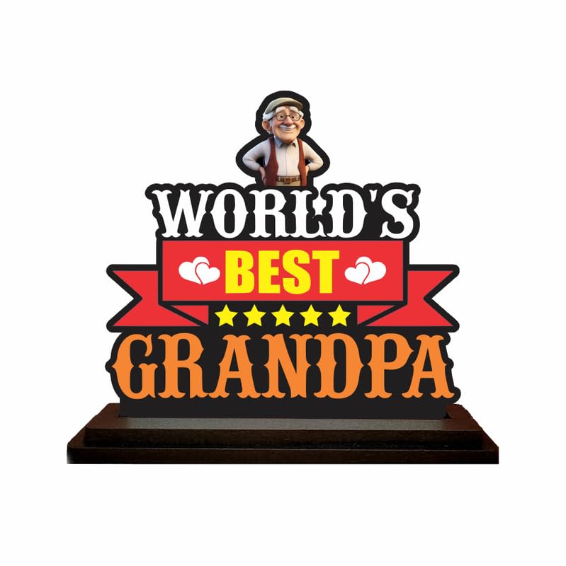 Bold & Heartfelt Design: Features ?World?s Best Grandpa? text with a cute grandpa figure, hearts, and stars to express love and admirationHigh-Quality MDF Material: Crafted from durable MDF wood with precise cuts and vibrant printing for lasting appealPerfect for Gifting: An ideal gift choice for birthdays, Grandparents Day, retirement, or any moment of appreciationCompact Tabletop Size: perfect for desks, side tables, or bookshelves without taking up too much spaceBright & Cheerful Colors: Eye-catching combination of red, yellow, black, and orange with fun graphics that uplift any room