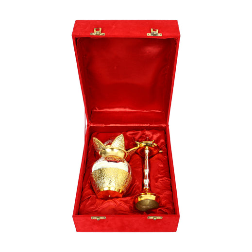 This elegant set features a beautifully embossed brass Kalash with a floral crown and a tall, sleek Diya, both finished in a lustrous gold and silver tone. Crafted with traditional designs, the set is ideal for pooja rituals and festive occasions. Presented in a vibrant red velvet box, it makes for a premium gifting choice. Each piece reflects fine artisan workmanship and cultural significance., Material - Brass