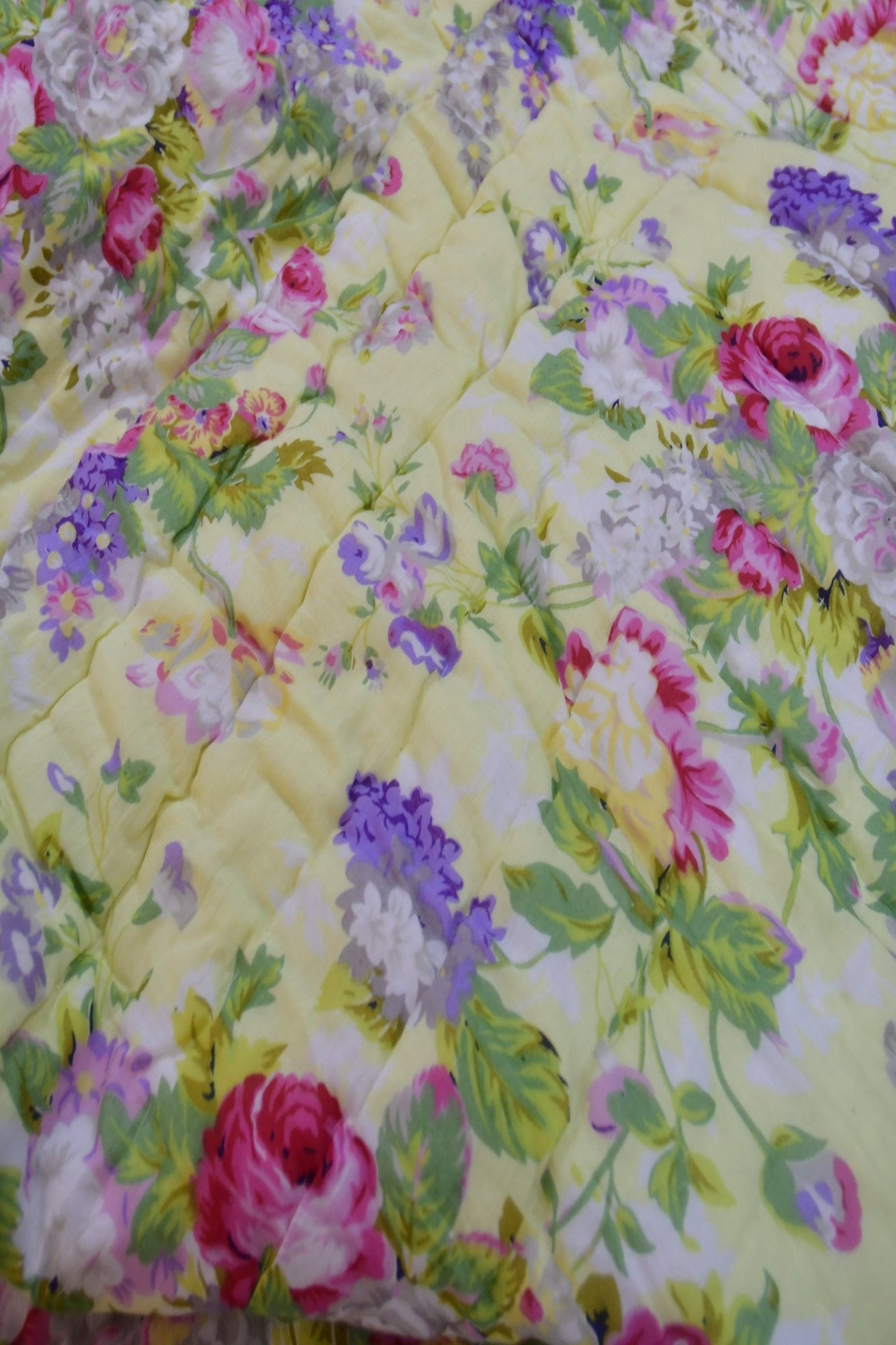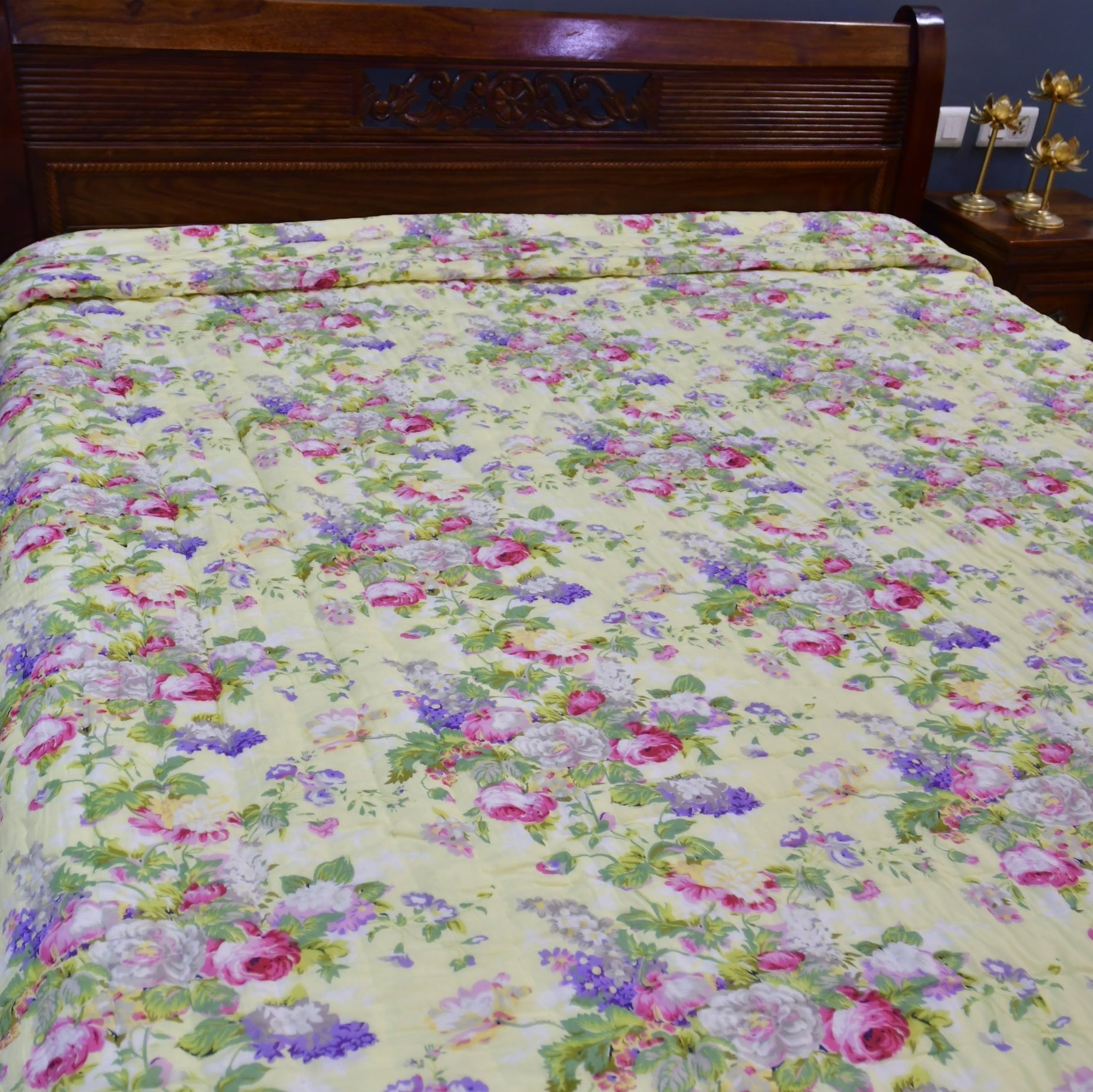 Snuggle in our cozy n soft cotton quilts.Just made for that perfect comfort ,everyone seeks in a quilt .Bright yellow colour n attractive floral design makes it perfect for any colour theme n decor.Beautiful floral design adds to the beauty of the Craftsmanship.size 90x108 inches100% cotton100% natural cotton filled