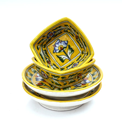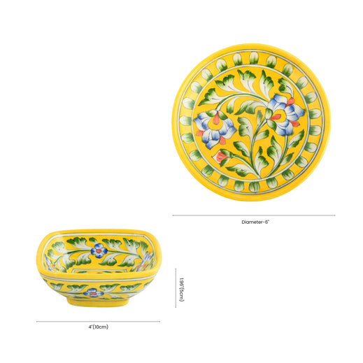 Yellow Floral Square Platter & Bowl Set Handcrafted Jaipur Blue Pottery for Timeless Dining