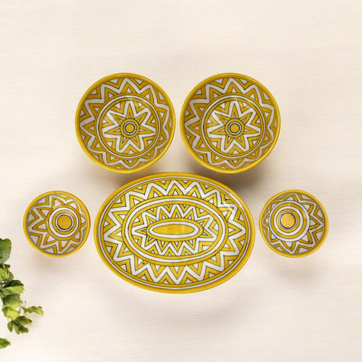 Yellow Geometric Oval Platter & Bowl Set Handcrafted Jaipur Blue Pottery for Modern Dining