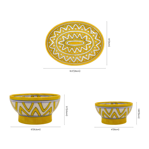 Infuse your dining space with contemporary flair using this striking Yellow Geometric Blue Pottery Set, featuring an oval platter and two bowls adorned with bold, hand-painted geometric patterns. The vibrant yellow finish and unique zigzag designs highlight the innovative spirit of Jaipur craftsmanship, blending tradition with modern aesthetics. Ideal for serving a variety of dishes or showcasing as a statement piece, this set elevates any dining occasion.Material - Blue Pottery - A blend of quartz powder, ground glass, saji, katira gond, and multani mitti.